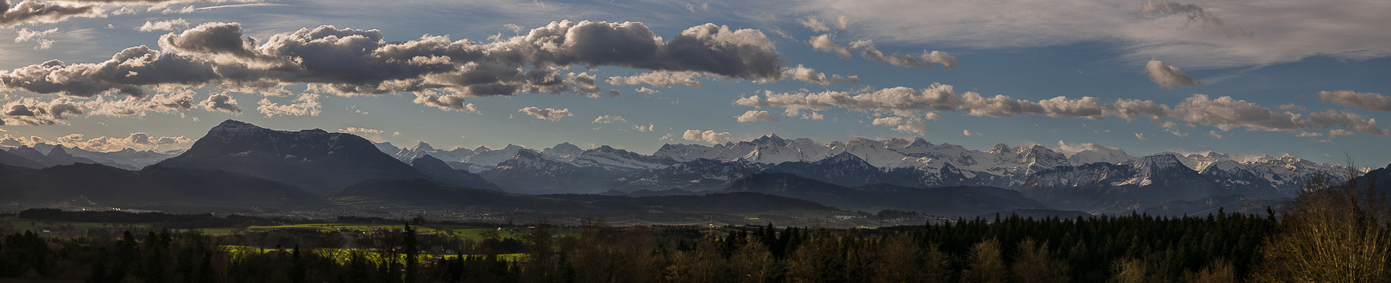 Zylindrisches Panorama der Alpen nach dem ersten Schnee im November 2015. Fotografiert mit Canon EOS 5D Mark II, Canon 70mm - 200mm, 2.8 L II in elf Bildern. Originalgrösse 0.45m x 4.85m
